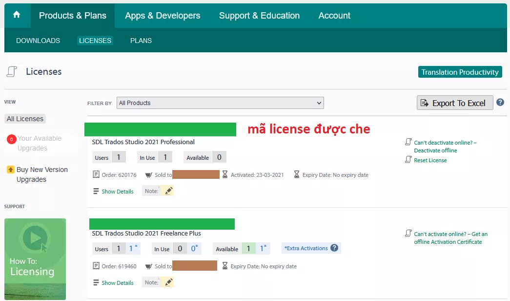 Dán mã bản quyền vào ô Activation Code, nút Activate sẽ sáng lên và bấm vào đó để kích hoạt bản quyền phần mềm. Trados Studio sẽ kết nối với máy chủ License của RWS và kích hoạt license của bạn, như hình bên dưới. Lúc này nếu bạn trở lại trang Licenses tại tài khoản RWS, bạn sẽ thấy số license đang sử dụng (In Use) tăng lên và số license chưa sửa dụng (Available) giảm đi.